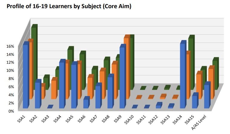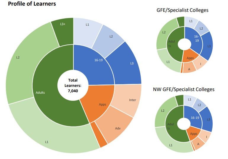 The report breaks down the profile of learning for each funding stream (16-19, adults, apprenticeships) by qualification level and sector subject area, enabling you to compare your college’s offer to that of a wider benchmark and identify any particular specialisms or potential growth opportunities. The report uses R14 ILR data submitted by colleges to MiDES for the previous full academic year.