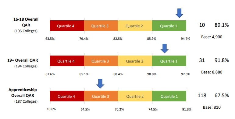 The Sunburst Report also provides relative ranking of colleges based on a range of performance data comparisons including: ESFA National Achievement Rate Tables; DfE 16-18 Key Stage 5 Performance Tables; and Ofsted Managment Information – Further Education and Skills. The relative ranking comparisons shown in the report include: