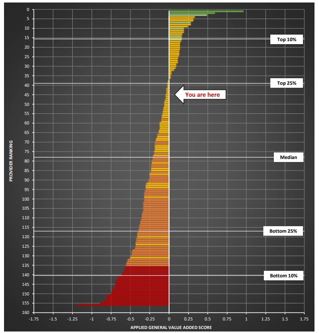 Within the report, colleges can identify their value added scores alongside their grade given by DfE (above or below national average) and their relative ranking within the AoC member college comparator group.