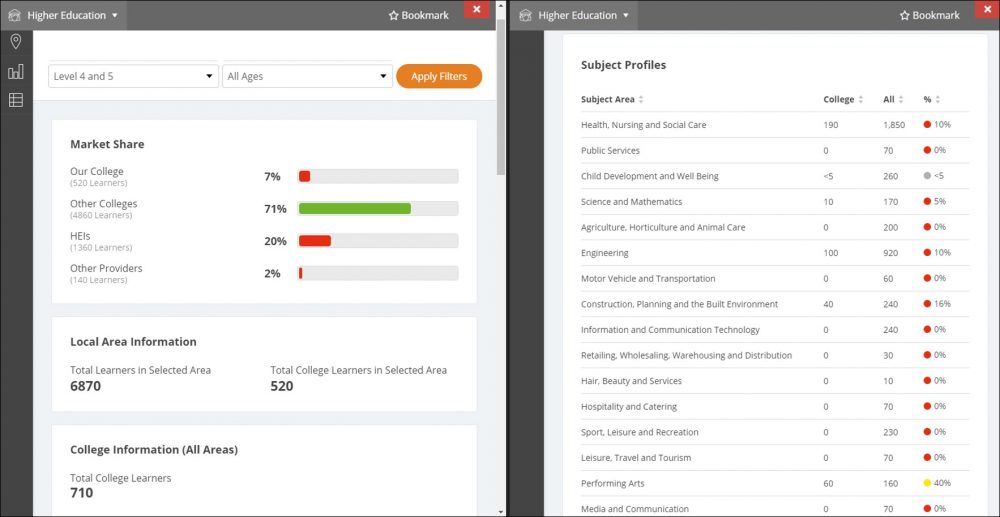 Vector enables colleges to explore the size and profile of the local HE market, providing information on the number of students who choose to take higher education courses at their local FE College compared to universities or other providers, and what the most popular qualification types, subjects and courses are.